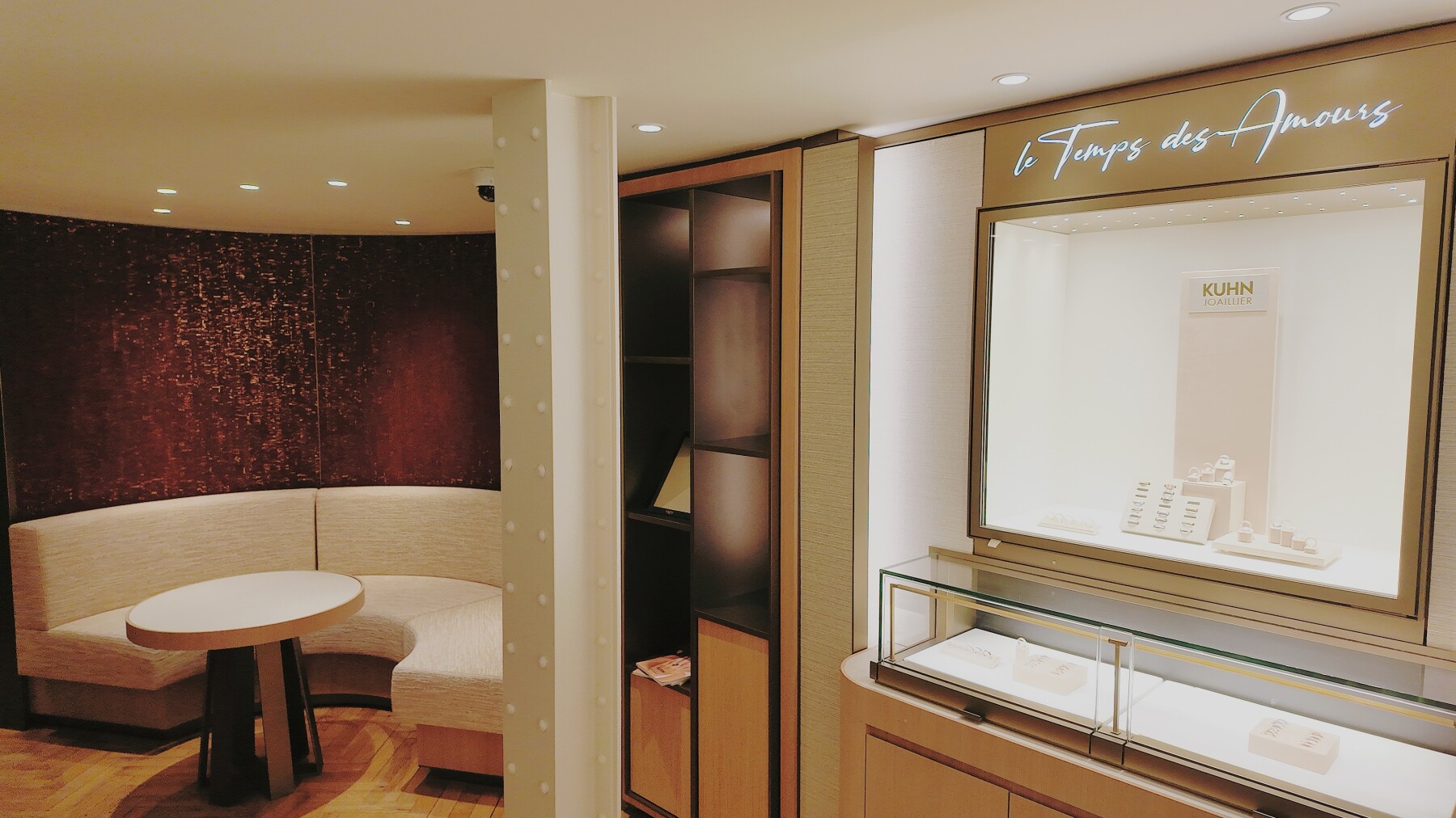 L'espace joaillerie se distingue par une atmosphère douce et élégante, où chaque détail invite à la contemplation.