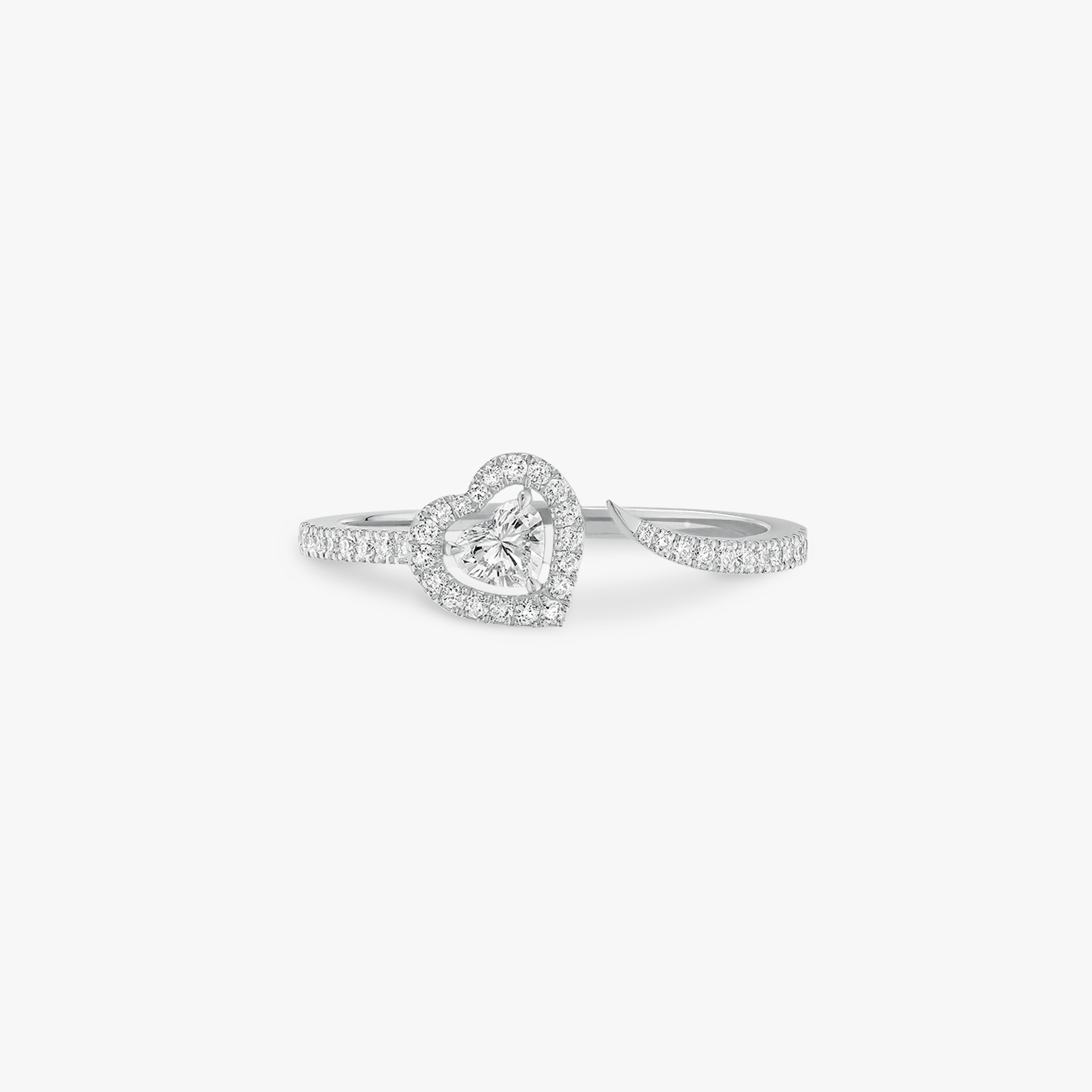 Le diamant central est entièrement entouré d’un pavage de diamants taille brillant, formant un halo en forme de cœur, parfaitement ajusté au contour de la pierre centrale. Cette construction renforce l’éclat global du bijou tout en soulignant la symbolique du motif.
