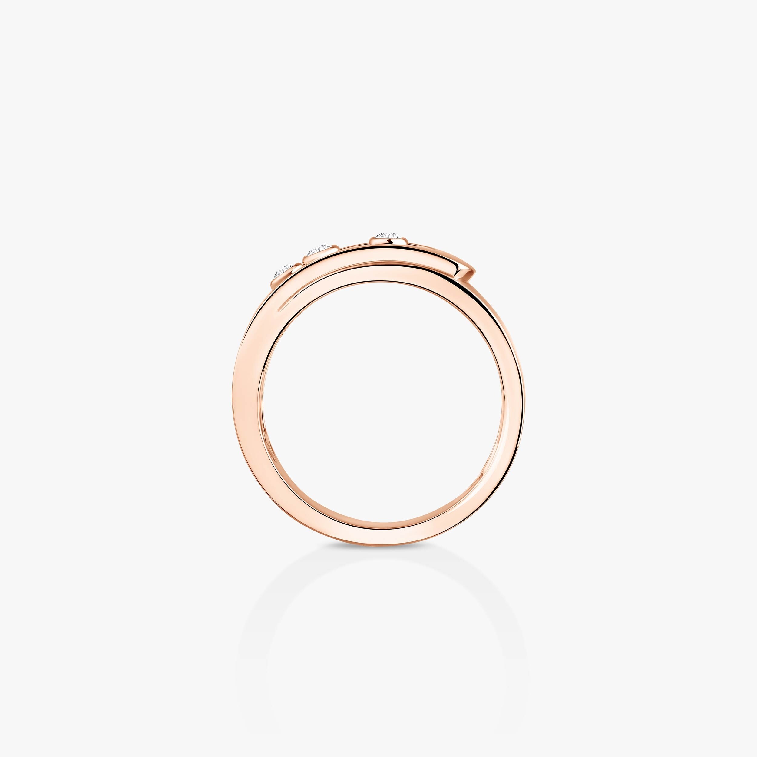 L'or rose poli miroir forme un écrin précieux aux diamants qui captent et réfléchissent la lumière à chaque mouvement. La monture bandeau épurée met en valeur la blancheur cristalline des pierres, créant un contraste saisissant avec la teinte rosée du métal. Les proportions étudiées de l'anneau offrent une élégance naturelle, tandis que le travail joaillier révèle la maîtrise technique de la maison.