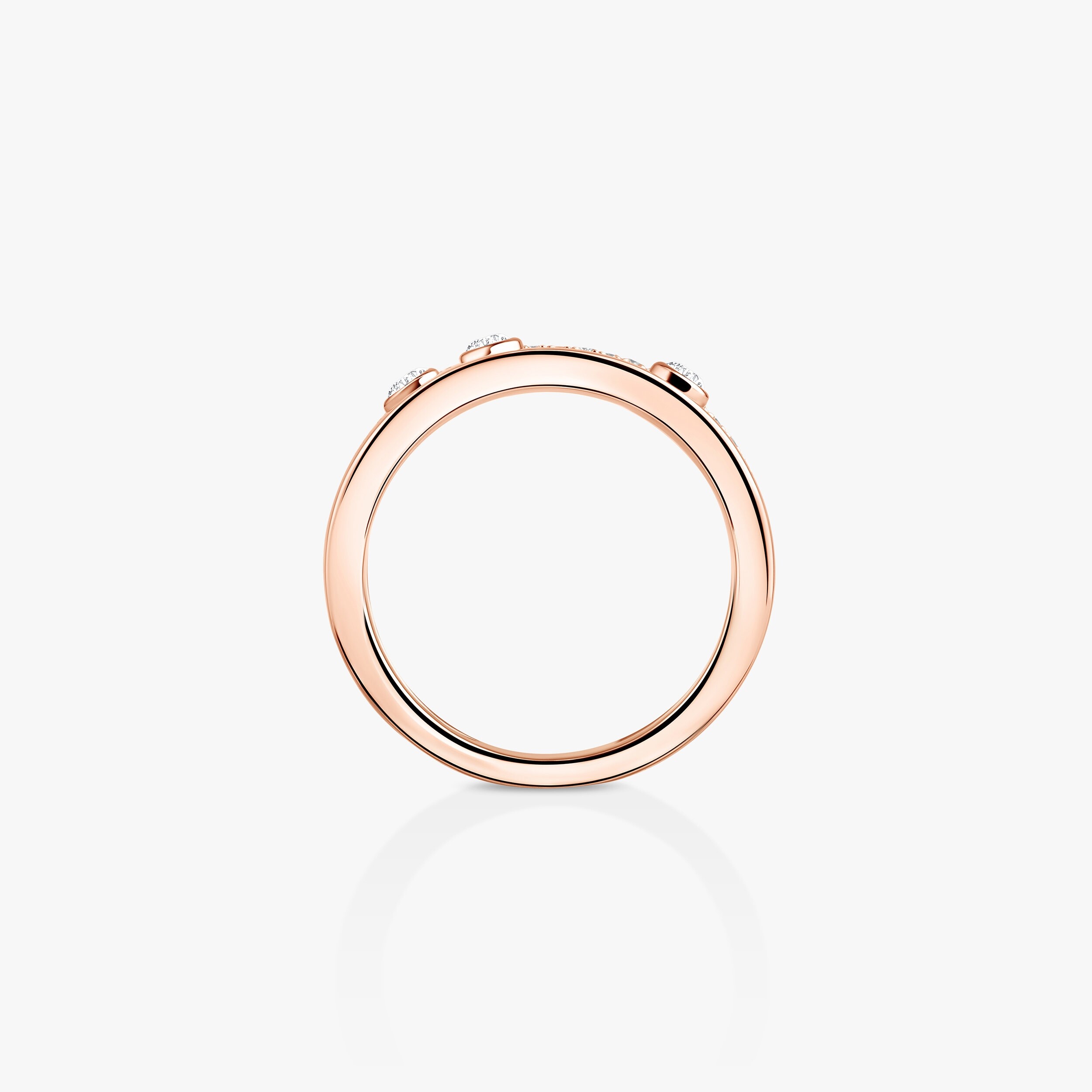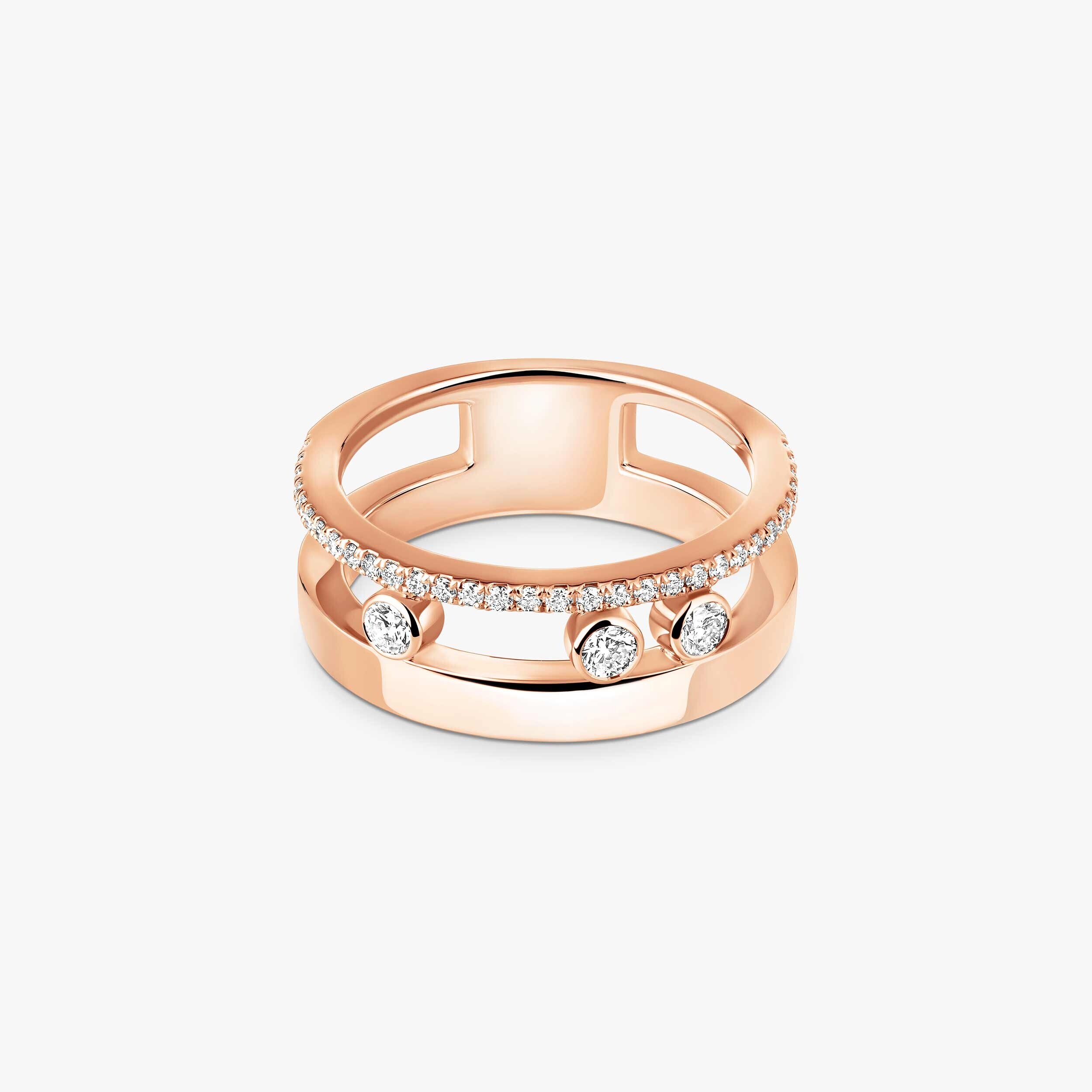 La bague se distingue par l’alternance entre lignes d’or rose lisses et rangées de diamants scintillants, créant un jeu de textures sophistiqué. Sa structure affirmée, aux contours nets et équilibrés, confère au bijou une présence élégante au doigt, tout en conservant une grande fluidité visuelle. Cette composition architecturée reflète parfaitement l’esthétique moderne et urbaine de la collection Move Romane.