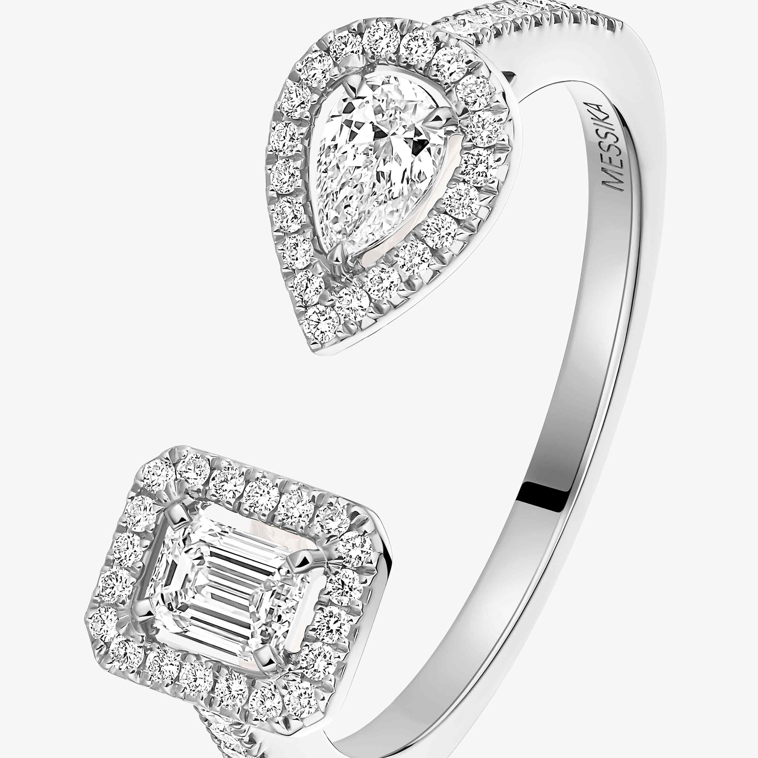La technicité de la référence 06471-WG repose sur le contraste saisissant de ses deux pierres centrales. D'un côté, le diamant taille poire déploie sa silhouette organique et ses facettes rayonnantes pour une brillance vive et féminine. De l'autre, le diamant taille émeraude, avec ses facettes rectangulaires en escalier, offre une profondeur architecturale et une clarté souveraine. Chaque pierre est sublimée par un entourage de diamants (halo) en serti grain, qui accentue visuellement leur volume. Le corps de bague, lui-même partiellement pavé, prolonge ce scintillement continu jusqu’au creux des doigts.