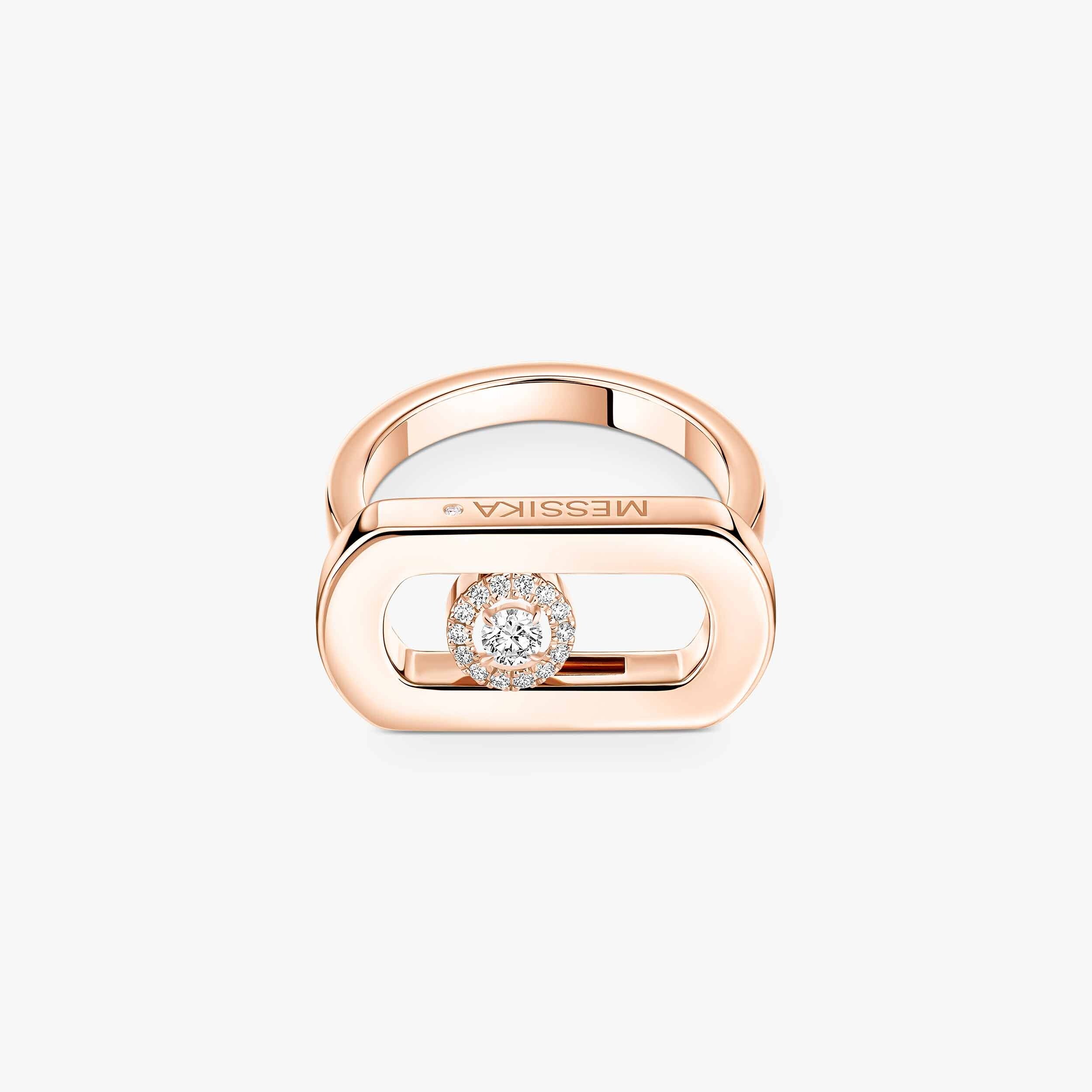Réalisée en or rose 750/1000e, la bague dévoile une teinte chaleureuse et lumineuse, caractéristique des créations Messika. Le travail du métal alterne surfaces polies miroir et zones serties, créant un jeu subtil entre éclat de l’or et scintillement des diamants.