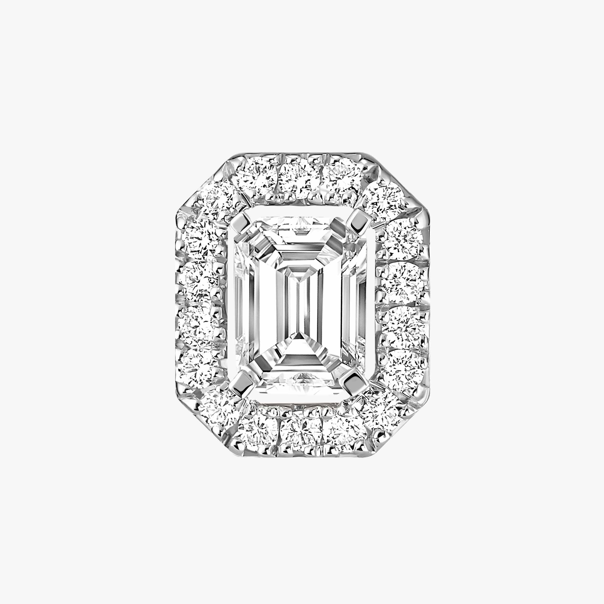 Réalisées en or blanc 18 carats (750/1000), ces boucles d’oreilles mettent en valeur trois diamants de 0,10 carat chacun, pour un poids total de 0,30 carat. La composition asymétrique se distingue par une construction raffinée : d’un côté, une boucle accueille un diamant taille émeraude, tandis que l’autre associe deux diamants, l’un taille émeraude, l’autre taille poire, créant un jeu de lignes et de proportions subtil. Cette association de tailles, signature My Twin, permet une diffusion de la lumière sous des angles variés, renforçant l’éclat naturel des pierres.