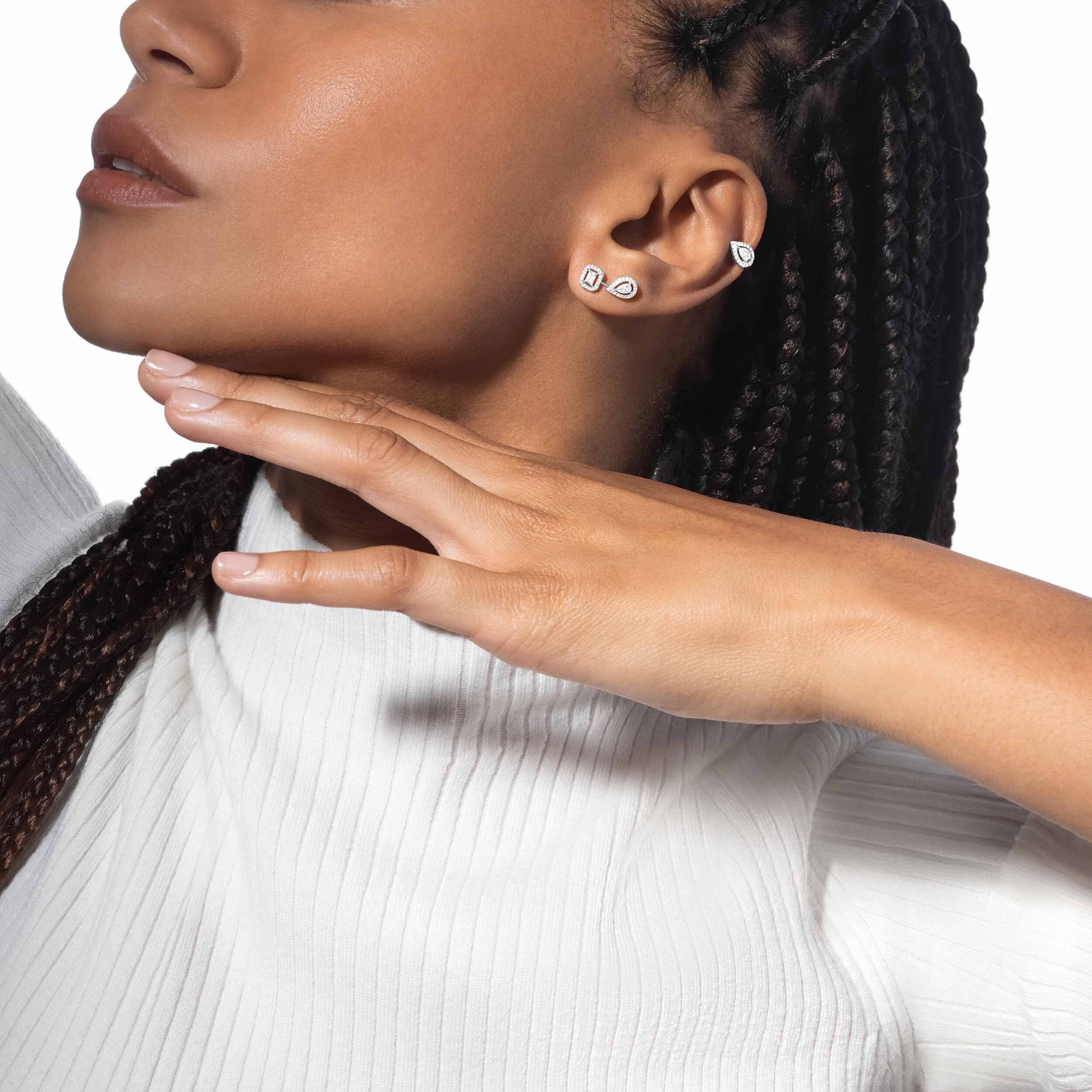 L’asymétrie assumée de cette création apporte une dimension résolument moderne au bijou. L’or blanc poli met en valeur la pureté graphique des diamants et souligne la finesse du sertissage, pensé pour préserver la légèreté visuelle et le confort au porté. Cette conception permet de porter les boucles seules ou de les intégrer facilement à une composition de bijoux plus personnelle, selon les envies.