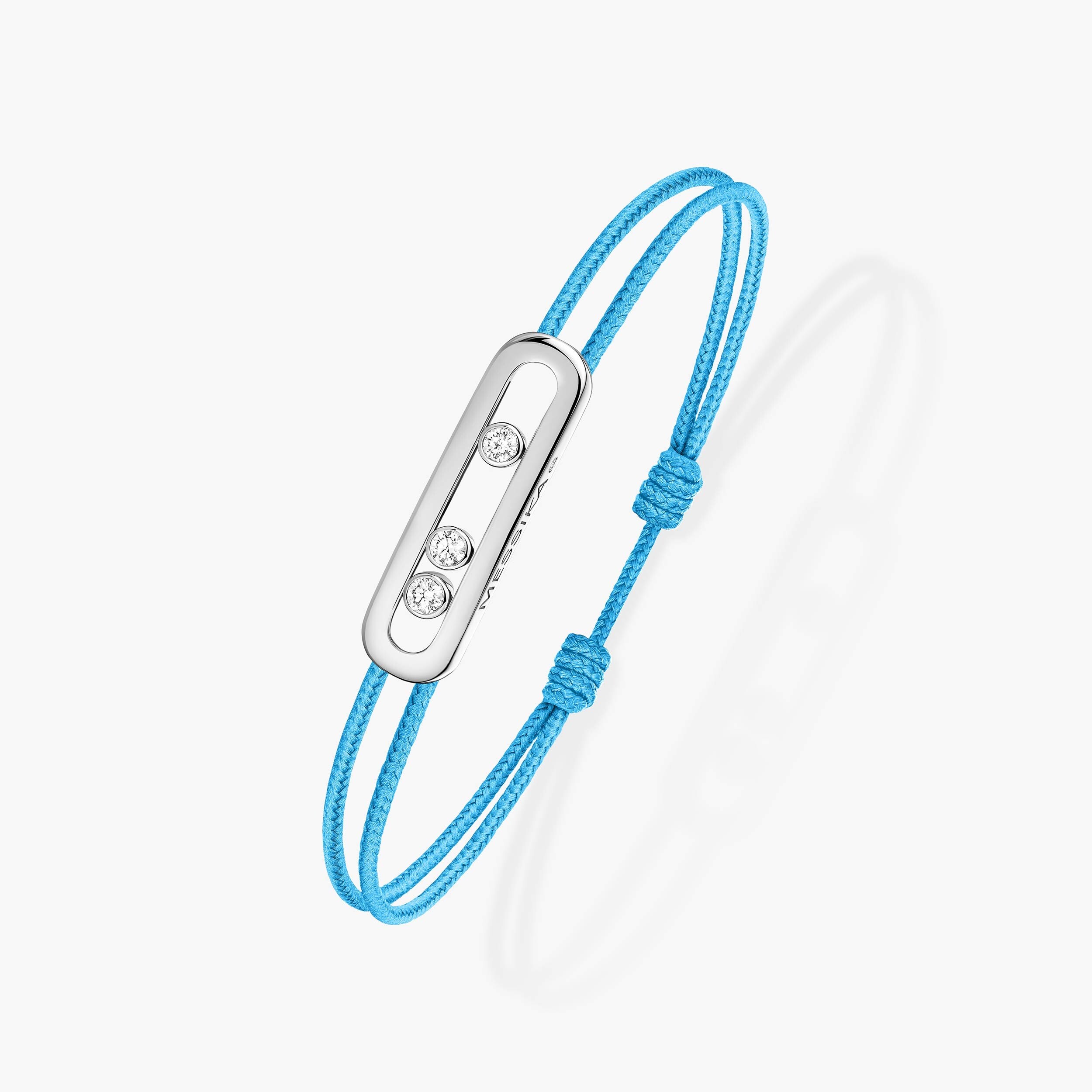 Issu de la collection Care(s), ce bracelet se distingue par son cordon textile bleu, réglable, conçu pour s’adapter à toutes les morphologies. En son centre, un motif Move iconique en or blanc 18 carats (750/1000e) accueille un diamant taille brillant, signature emblématique de Messika.