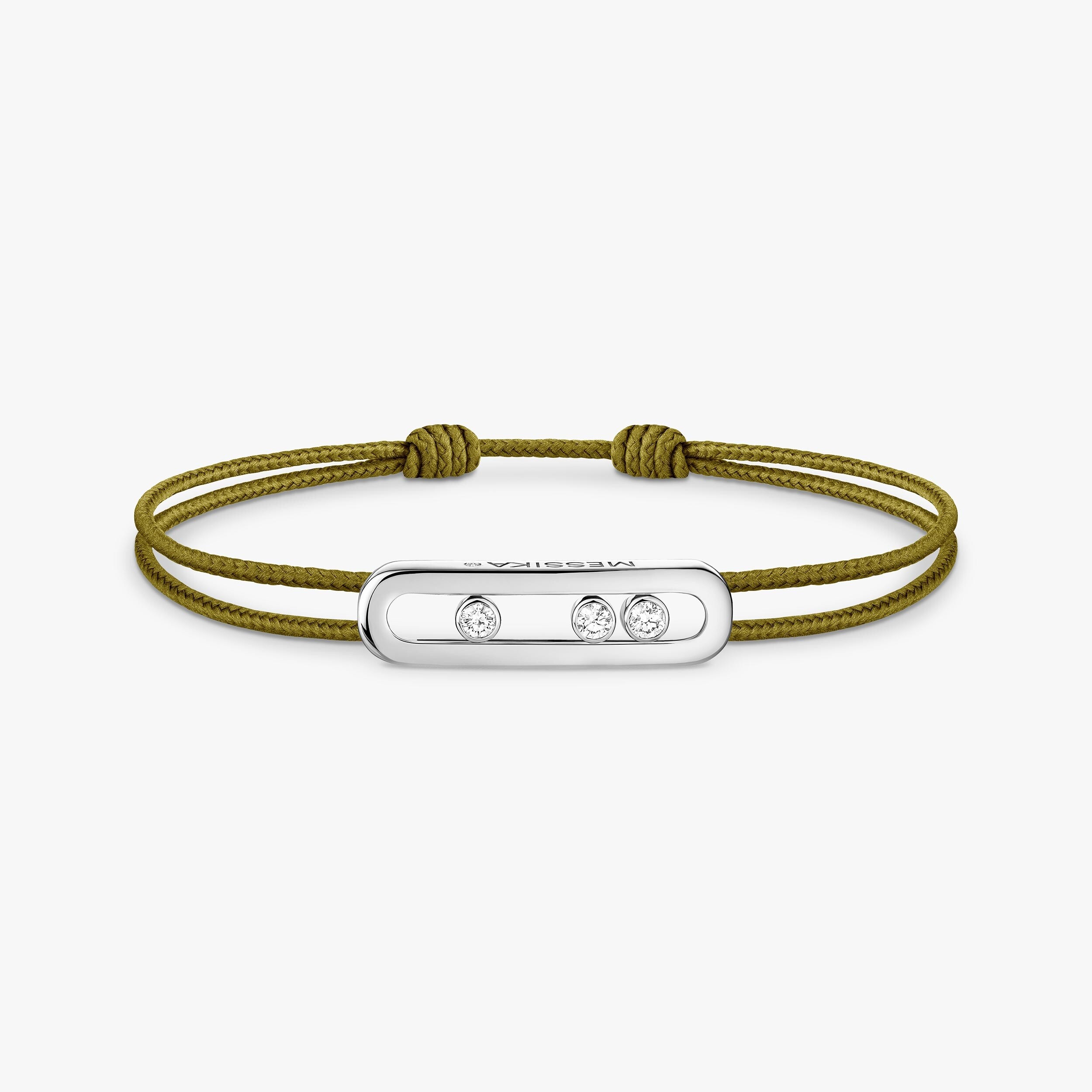 Conçu pour être porté comme une seconde peau, ce bracelet est monté sur un cordon résistant doté de nœuds coulissants ajustables, garantissant un confort absolu et une adaptation parfaite à tous les poignets. Les deux embouts en or blanc ajoutent une finition précieuse à ce design minimaliste. Idéal pour le « stacking » (accumulation), il s’associe avec audace à des montres ou d'autres bracelets Move. Le Messika Care(s) kaki incarne une élégance de conviction, prouvant que le diamant peut s'inviter avec simplicité dans chaque instant de vie.