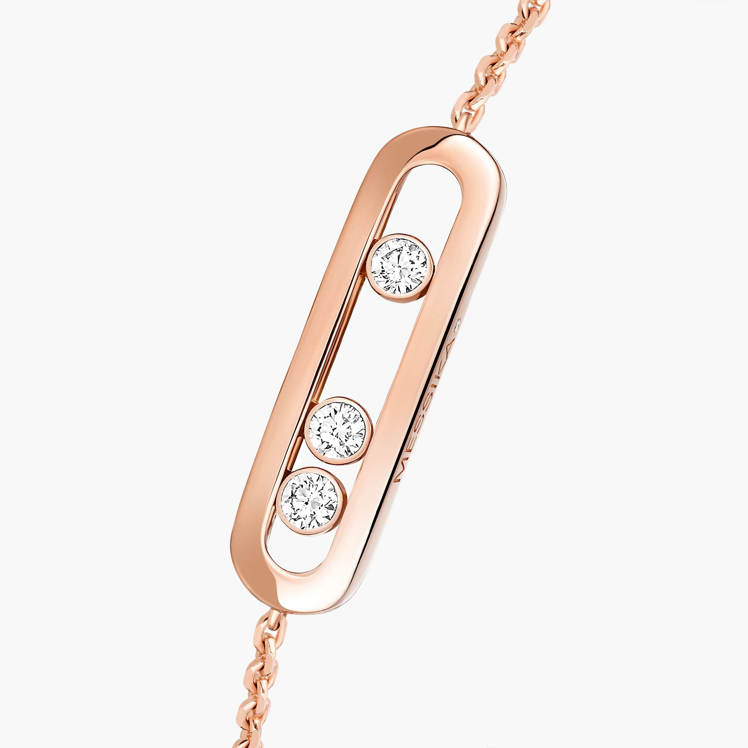 Réalisé en or rose 18 carats (750/1000), ce bracelet met en scène un diamant taille brillant mobile, signature emblématique de la ligne Move Uno. Le diamant, libre de glisser dans son écrin central, capte la lumière à chaque mouvement du poignet, apportant une animation subtile et raffinée.