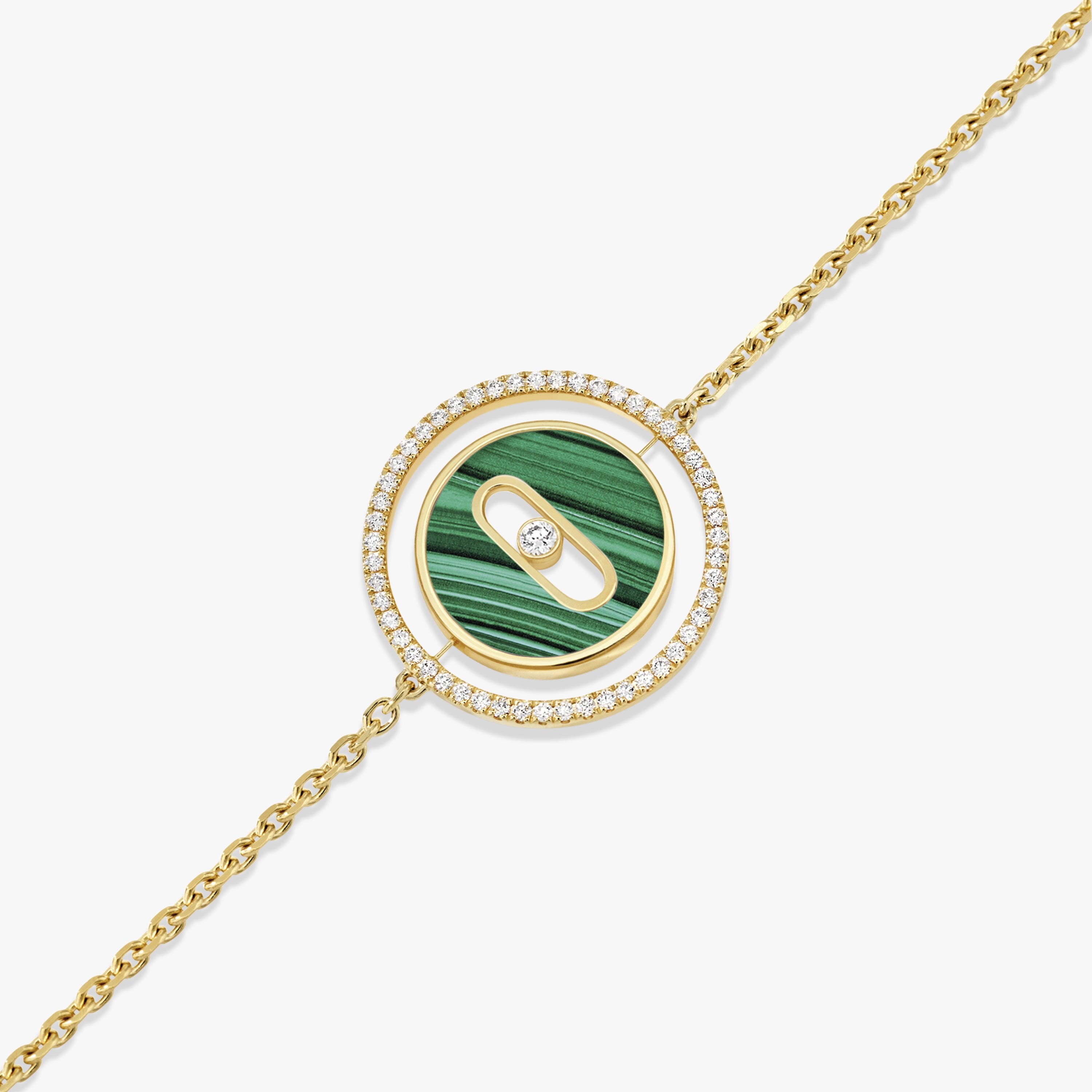 Réalisé en or jaune 18 carats (750/1000), ce bracelet se distingue par son motif Lucky Move PM. Celui-ci accueille une malachite naturelle, pierre réputée pour ses nuances vert intense et ses veines graphiques uniques, faisant de chaque bijou une pièce singulière.