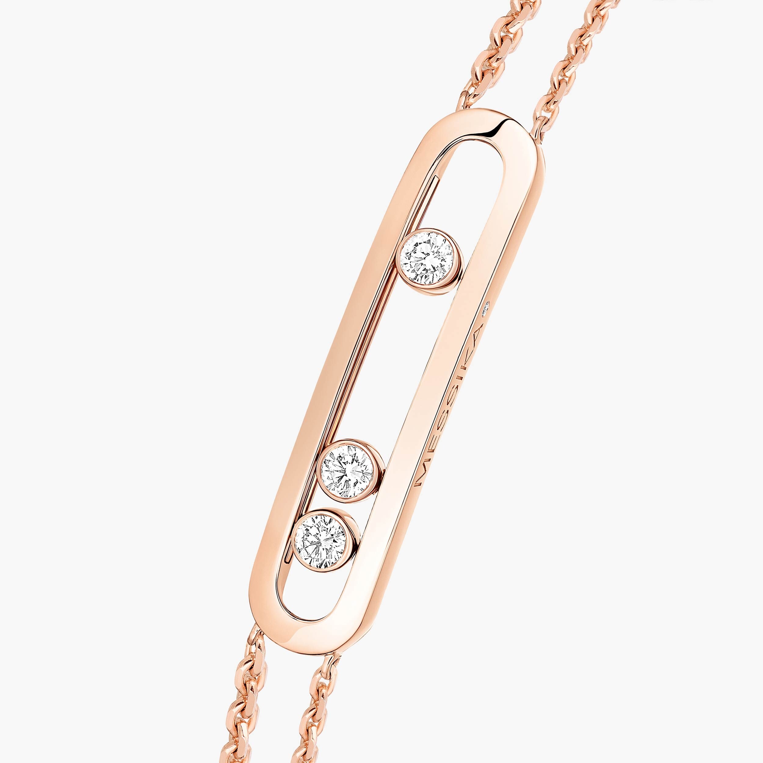 Réalisé en or rose 18 carats (750/1000), ce bracelet est orné de trois diamants taille brillant, dont les mouvements délicats captent et reflètent la lumière, signature emblématique de la collection Move. Le poids total des diamants est d’environ 0,25 carat, offrant une brillance équilibrée qui sublime l’ensemble sans alourdir la ligne.