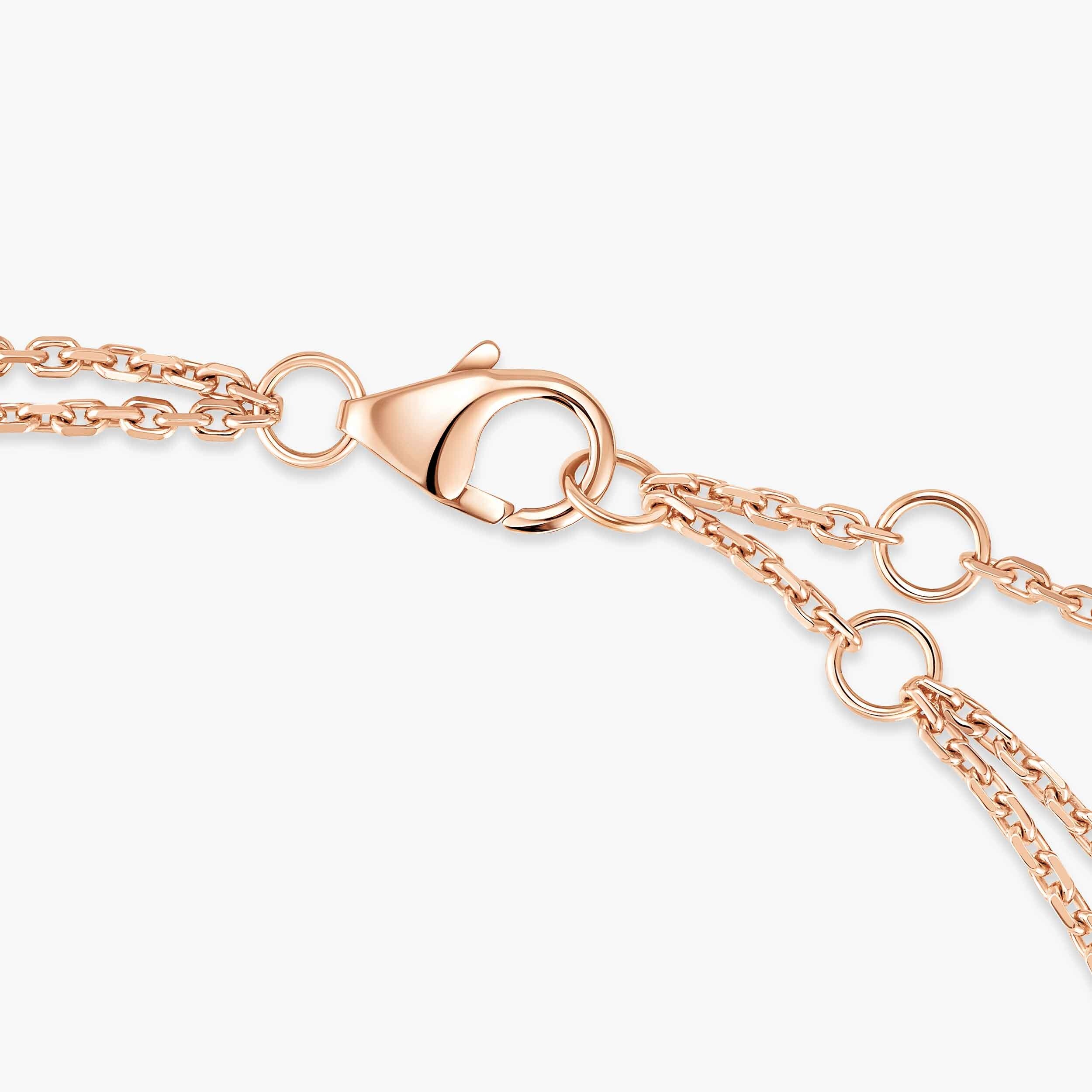 Doté d’une double chaîne délicate, ce bracelet s’installe avec finesse autour du poignet, révélant une esthétique à la fois contemporaine et féminine. L’or rose poli miroir apporte une couleur douce et lumineuse qui met en valeur les diamants mobiles, créant un contraste subtil entre métal précieux et éclat des pierres.