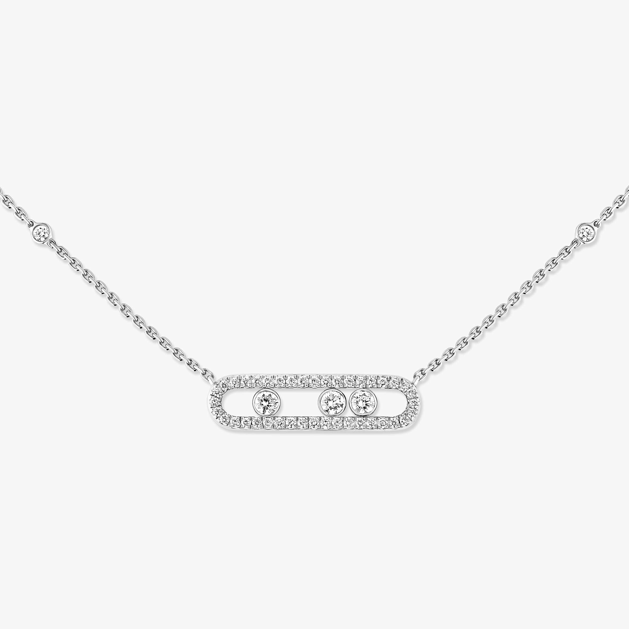 Réalisé en or blanc 18 carats (750/1000), ce collier met en valeur diamants taille brillant, dont le poids total est d’environ 0,35 carat. Les trois diamants mobiles au centre du motif symbolisent la dynamique du mouvement, créant un jeu de lumière subtil à chaque geste. Le pavé qui habille la surface du pendentif reflète la qualité d’exécution propre à Messika, où l’or capte et amplifie la lumière des pierres.