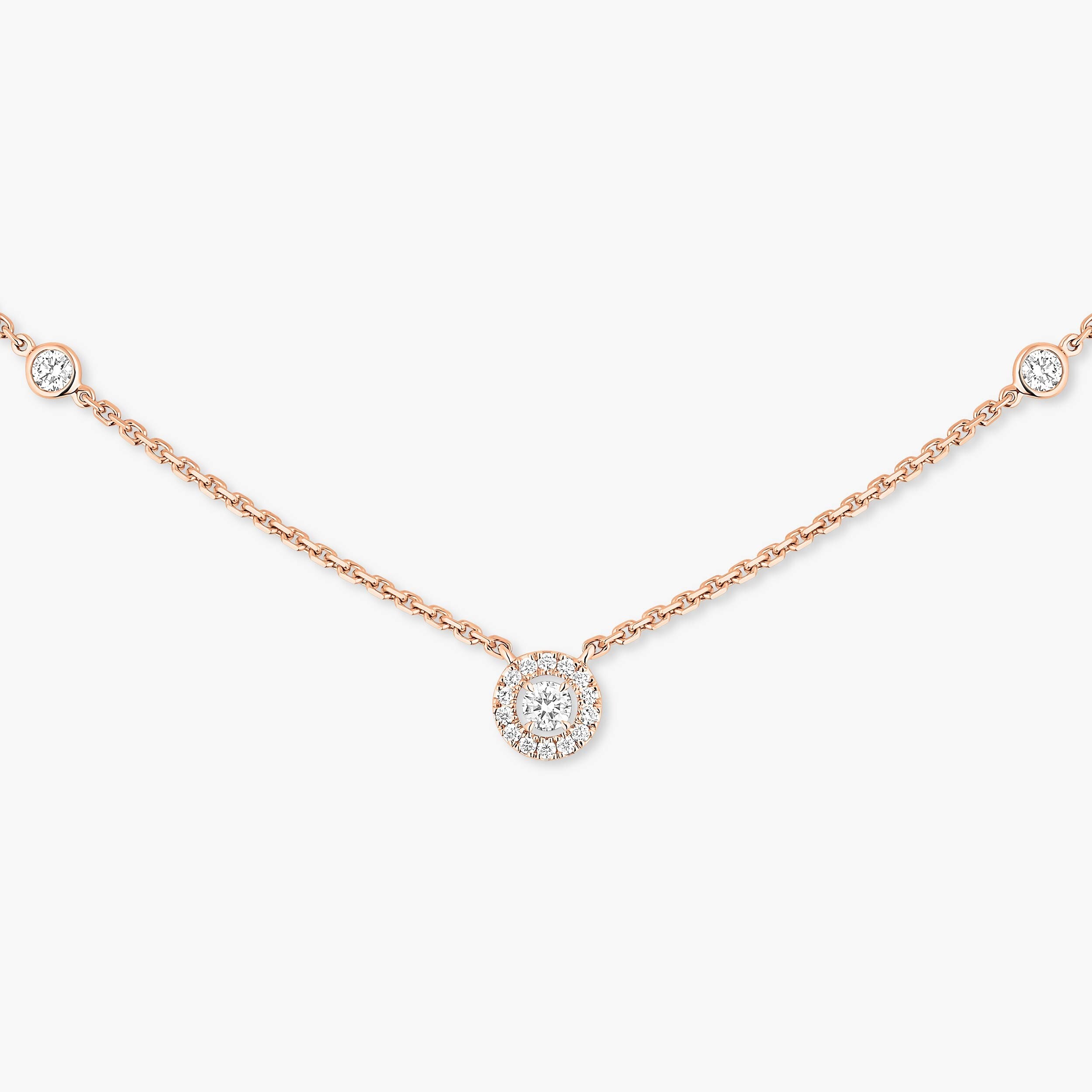 Réalisé en or rose 18 carats (750/1000), ce collier séduit par la douceur de son métal aux reflets chaleureux. Il est orné d’un diamant central taille brillant, mis en valeur par un serti clos circulaire, signature de la collection Joy. L’ensemble des diamants taille brillant présente un poids total de 0,10 carat, offrant une brillance subtile et maîtrisée, idéale pour un porté quotidien. Ce type de sertissage protège la pierre tout en renforçant son éclat naturel.