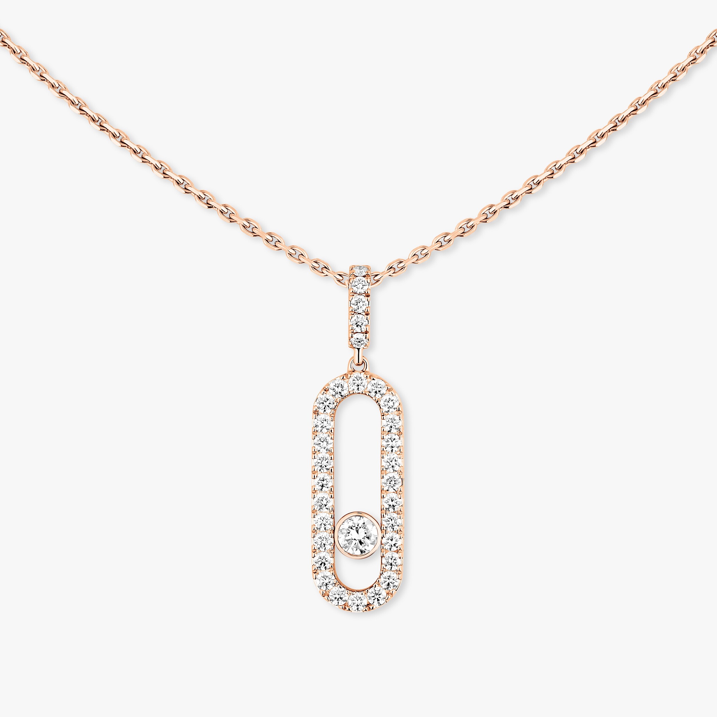 Réalisé en or rose 18 carats (750/1000), ce collier grand modèle met en lumière un diamant central mobile, libre de coulisser au cœur du motif Move Uno pavé de diamants. Cette mobilité emblématique apporte une dimension à la fois ludique et précieuse au bijou, captant la lumière à chaque mouvement.